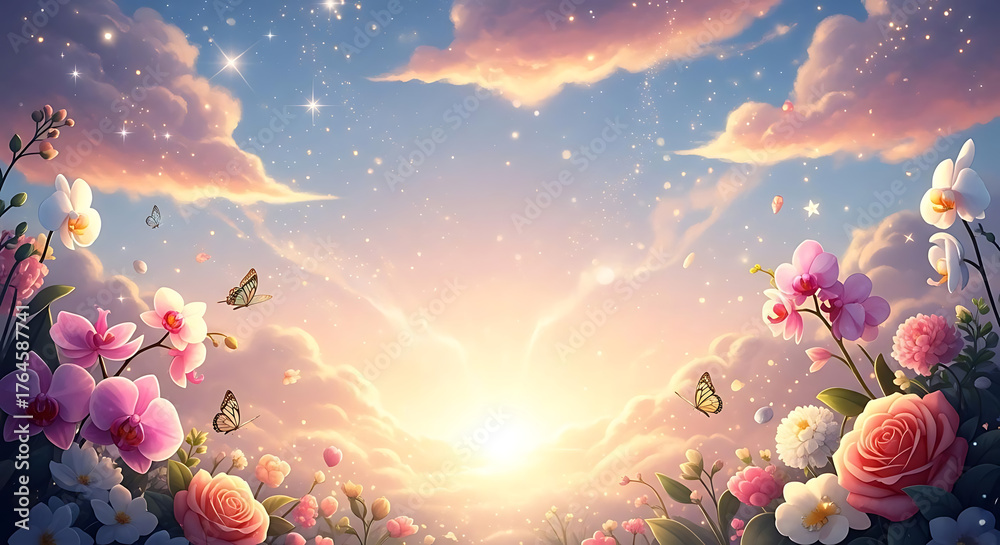 A dreamy landscape with flowers, butterflies, clouds, and a bright sky at sunset or sunrise ai generated #1764587741
