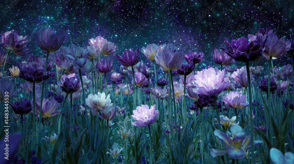 A dreamy midnight tulip meadow where flowers shine with natural iridescent glow under moonlight #1483445530