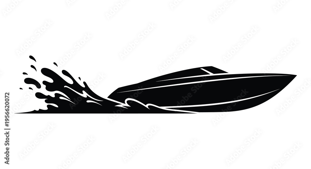 A dynamic black silhouette of a speedboat cutting through water leaving a splashing wake behind it silhouette high quality professional detailed #1956620072