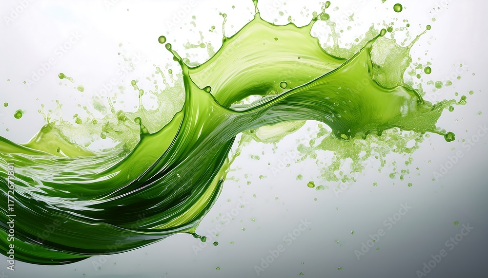 A dynamic liquid motion advertisement for a healthy drink or smoothie featuring a solitary green juice splash on a white background #1772677841