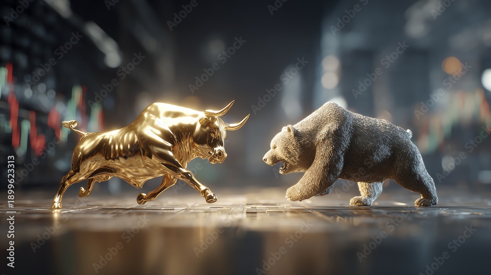 A dynamic representation of financial market trends, featuring a golden bull and a bear facing off against a backdrop of fluctuating stock graphs. Symbolizes market volatility. #1899623313