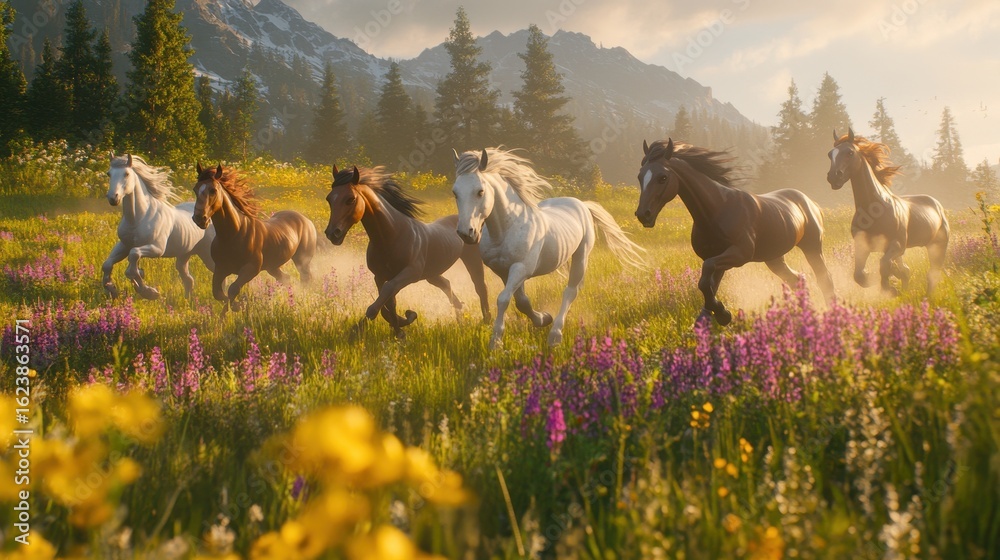 A dynamic shot of seven horses running through a wildflower meadow during festive season #1623863571