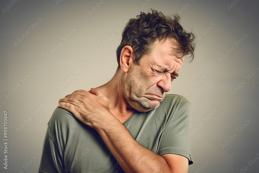 A European man clutching his shoulder as if experiencing discomfort or shoulder pain #908750647