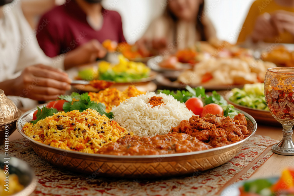 A Family Gathered Around A Large Indian Food Thali At A Dining Table, Sharing Laughter And Serving Food To Each Other, Capturing The Essence Of Indian Communal Dining #1041136079