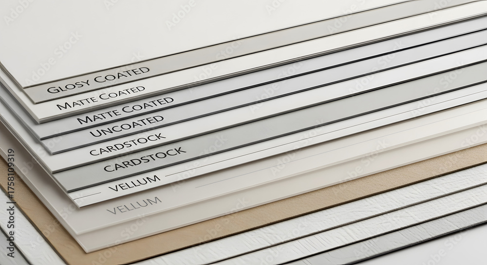 A fanned out collection of various paper and cardstock samples showing different textures finishes and weights for printing #1758109319