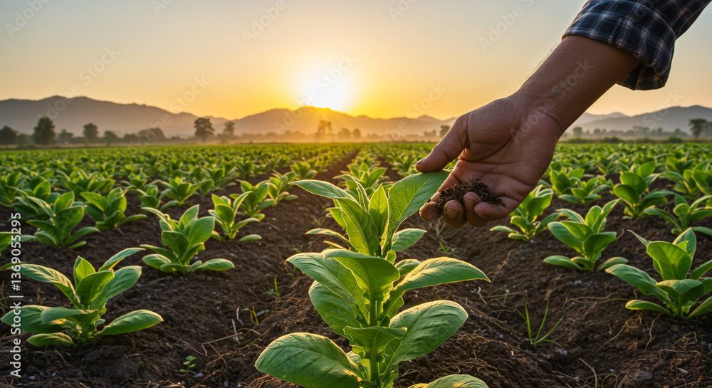A farmer's hand gently cradles a tobacco plant at sunset, the rich soil promising a bountiful harvest in a vast, tranquil field. #1369055295