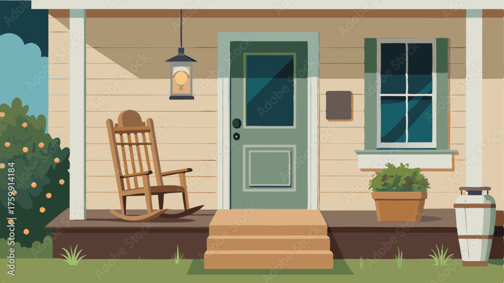 A farmhousestyle front porch with a wooden rocking chair a metal mailbox and a hanging plant basket. #1759914184