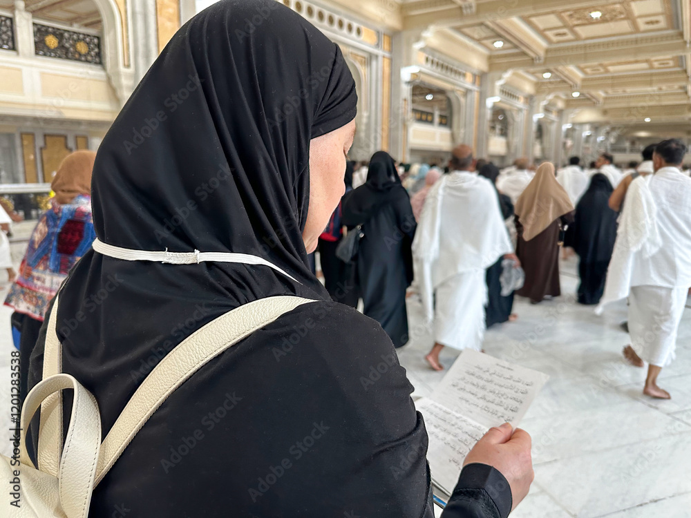 A female pilgrim performs Umrah, walks between Safa and Marwa and reads prayers in the Sacred Mosque of Al Haram in Mecca. #1201283538