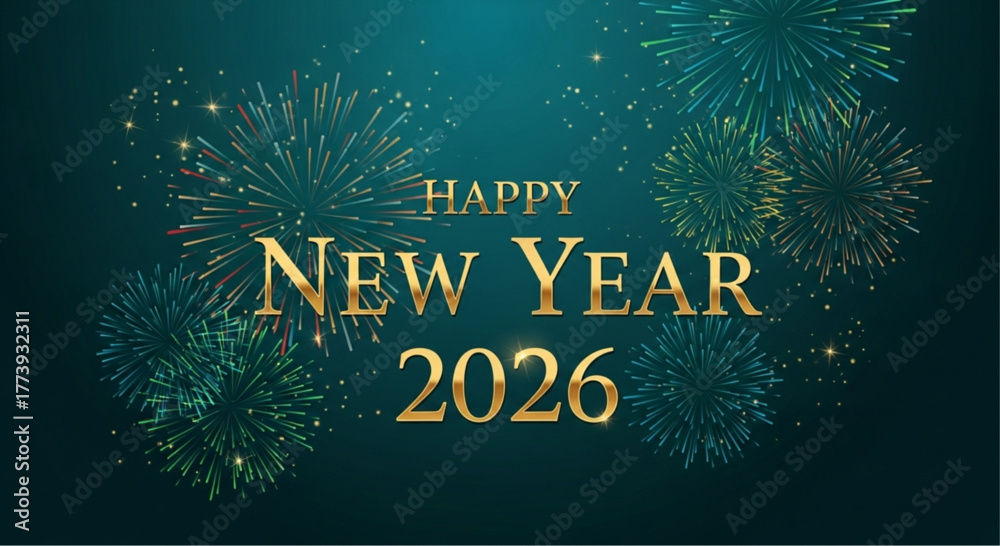 A festive and vibrant New Year's greeting for 2026, where fireworks burst in a kaleidoscope of colors against a dark background, the gold Happy New Year 2026 text. vector illustration #1773932311