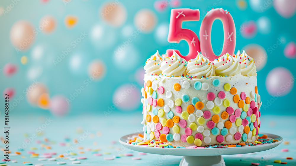 A festive birthday cake with colorful sprinkles and a 50 topper, set against a vibrant, blurred background of balloons #1814386657