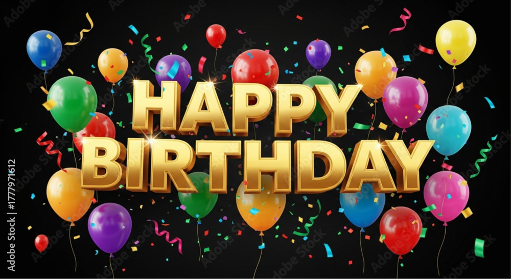 A festive celebration with vibrant balloons, sparkling confetti, and golden letters. HAPPY BIRTHDAY words on the image to spread joyful moments. vector illustration #1777971612