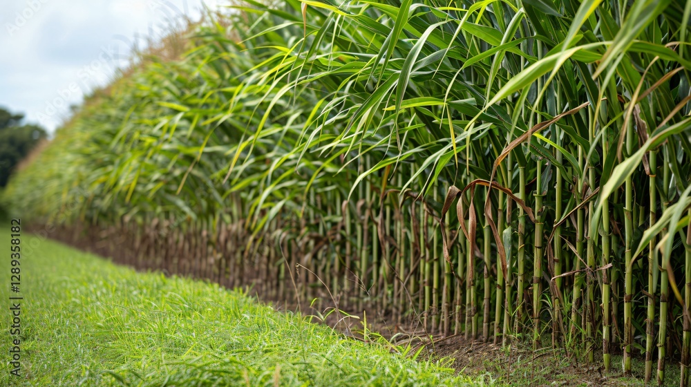 A field of sugarcane and corn crops, the raw materials for ethanol fuel production, emphasizing their role in bioenergy as an alternative energy source #1289358182