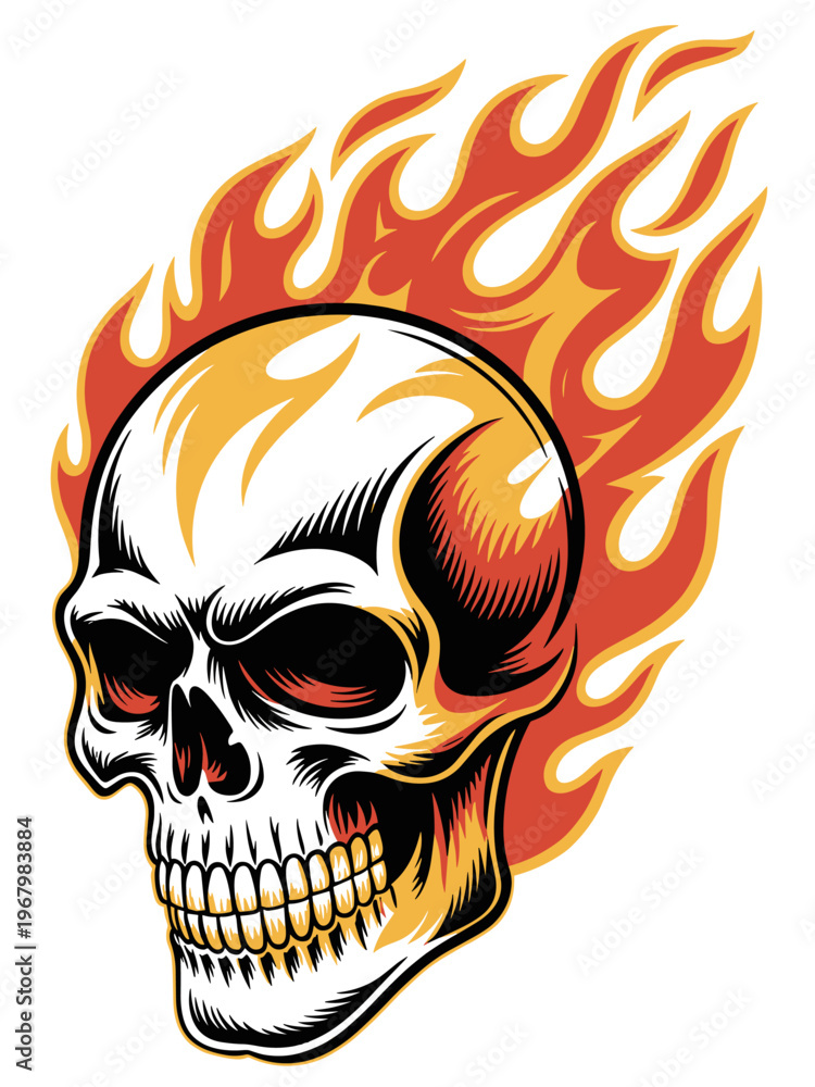A fierce flaming human skull illustration featuring dynamic orange fire embers and intense heat radiating textures for bold tattoo designs, heavy metal music branding, biker culture apparel and macabr #1967983884