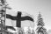A Finnish flag flutters in the wind, set against a backdrop of snow-covered pine trees under a clear blue sky #1066791318