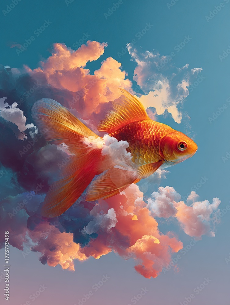 A fish hovers in a bright blue sky next to a fluffy cloud, a surreal scene #1773779498