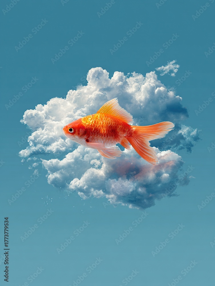 A fish hovers in a bright blue sky next to a fluffy cloud, a surreal scene #1773779534