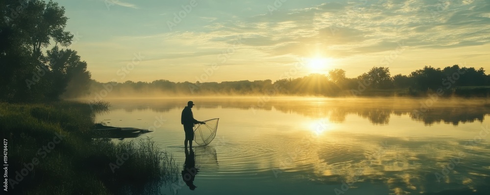 A fisher casting a net into the water as the sun rises, 4k photo. #1194784477