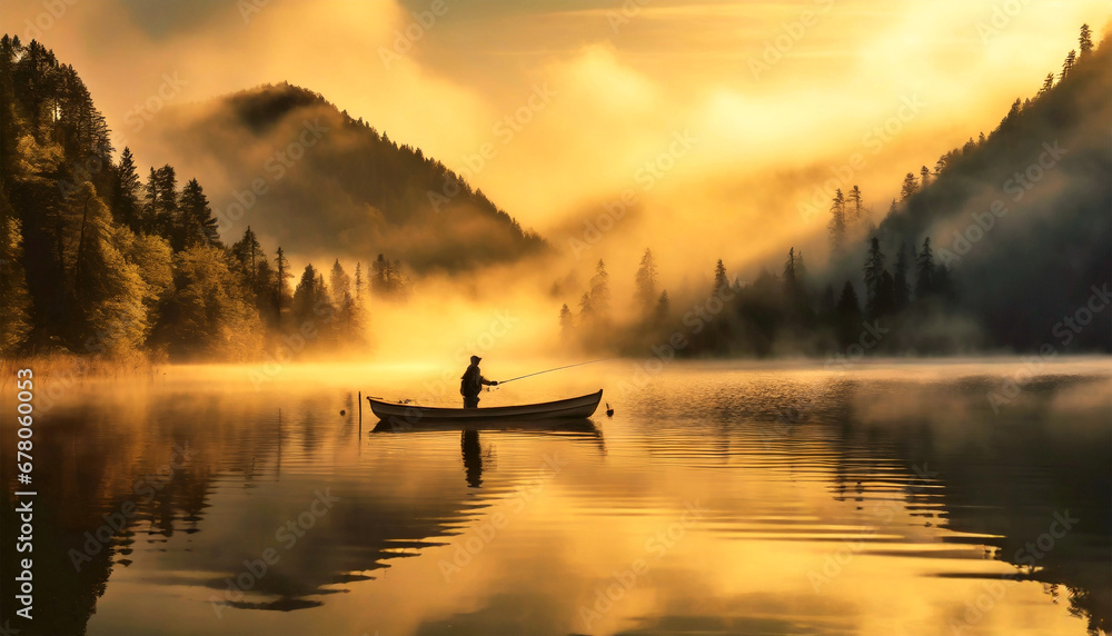 A fisherman with his fishing rod, aboard a small rowing boat, fishing in the waters of a beautiful mountain lake with morning fog at dawn, orange and black fantasy landscape with pine forest. #678060053