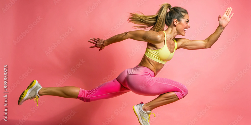 A fit athlete in sportswear vigorously jumps and warms up against a bright background. Her strong posture and determined expression reflect her athleticism and determination #898353825