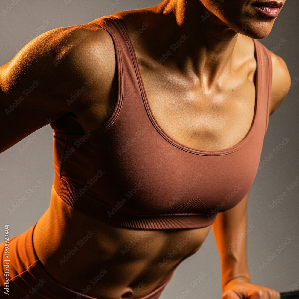A fit woman in a brown sports bra is captured in a dynamic pose showcasing her toned physique and athletic build. #1908729404