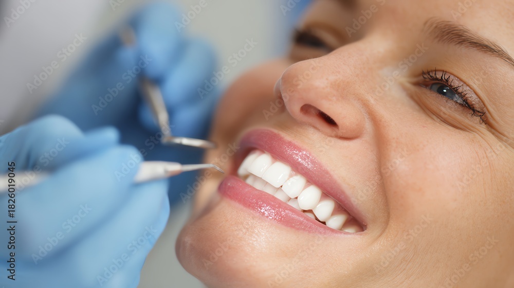 A focused dental professional provides care to a smiling patient, highlighting the importance of regular check-ups and oral hygiene. A bright, healthy smile is the goal. #1826019045