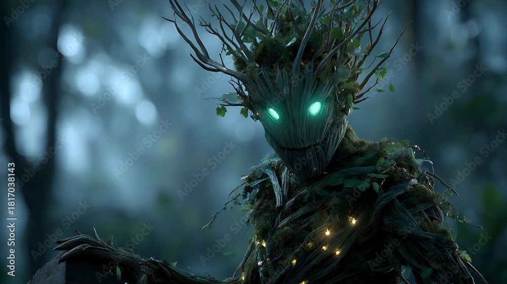 “A forest guardian spirit made of branches and fireflies, glowing emerald eyes, misty woodland background, cinematic fine art lighting #1817038143
