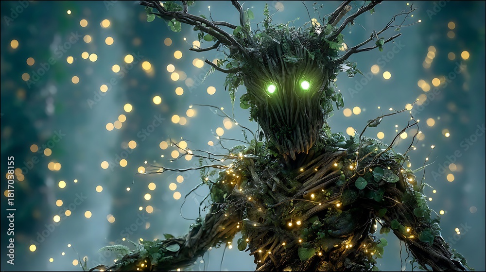 “A forest guardian spirit made of branches and fireflies, glowing emerald eyes, misty woodland background, cinematic fine art lighting #1817038155