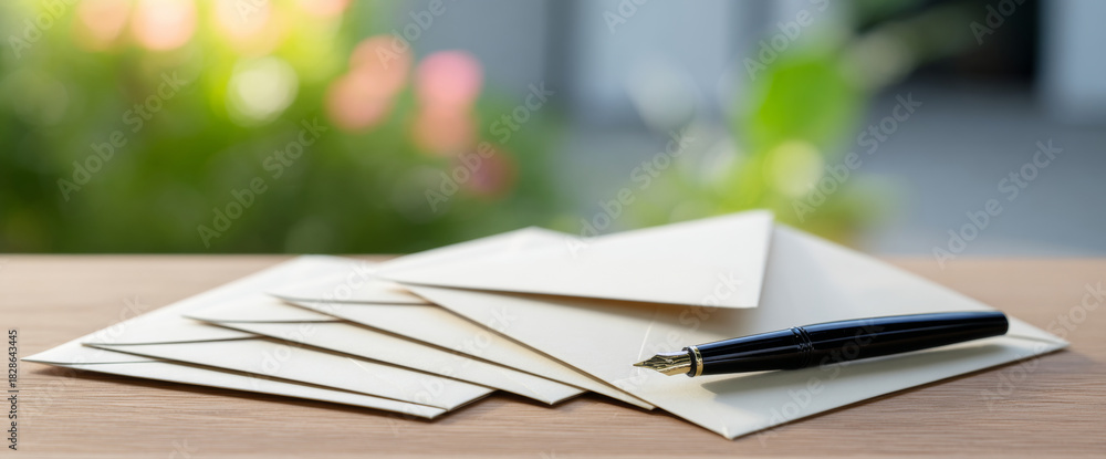 A fountain pen sits on top of a pile of white envelopes, ready to be addressed and mailed out #1828643445
