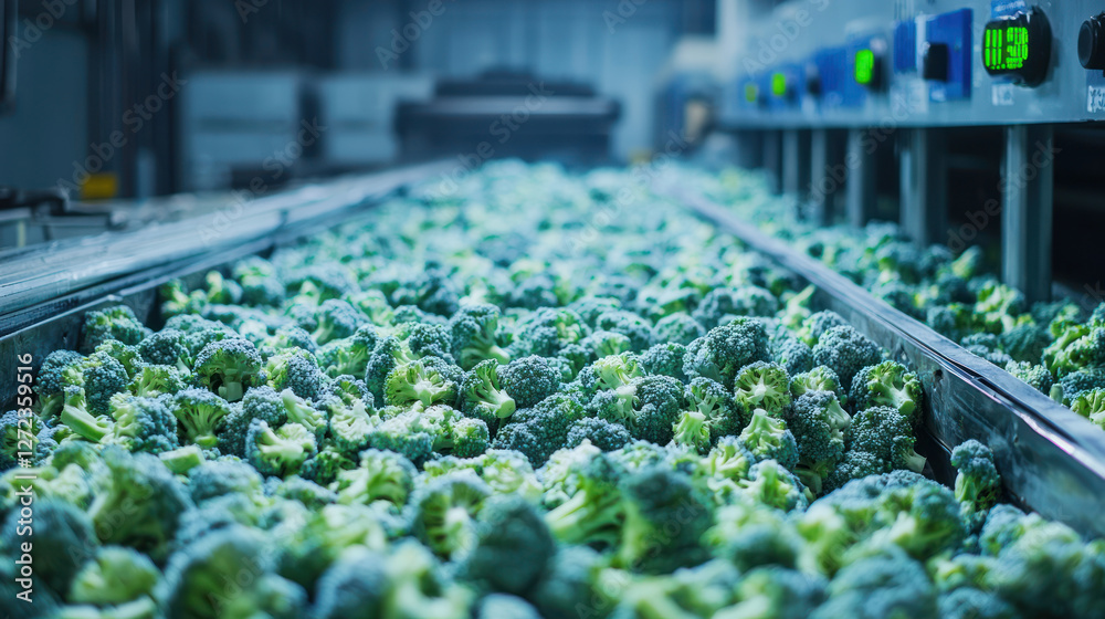A Fresh frozen broccoli florets in distribution center with temperature gauges. cool blue tones create serene atmosphere #1272359516