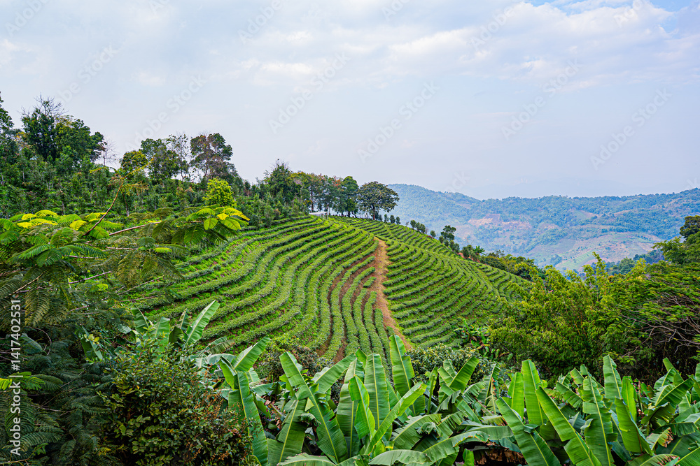 A fresh view of lush green hills with a tea plantation stretching in beautiful rows. Surrounded by banana leaves and forest, the peaceful landscape offers a calm, refreshing, and natural background. #1417402531