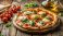 A freshly baked Margherita pizza garnished with a sprig of fresh basil and a drizzle of olive oil on a rustic wooden table, food photography, basil #1743853181