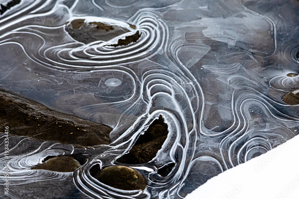 A frozen stream maps winding channels around embedded stones. Rings and arcs stack together as if sketched by winter itself creating a serene tapestry of movement balance and quiet order. #1934334416