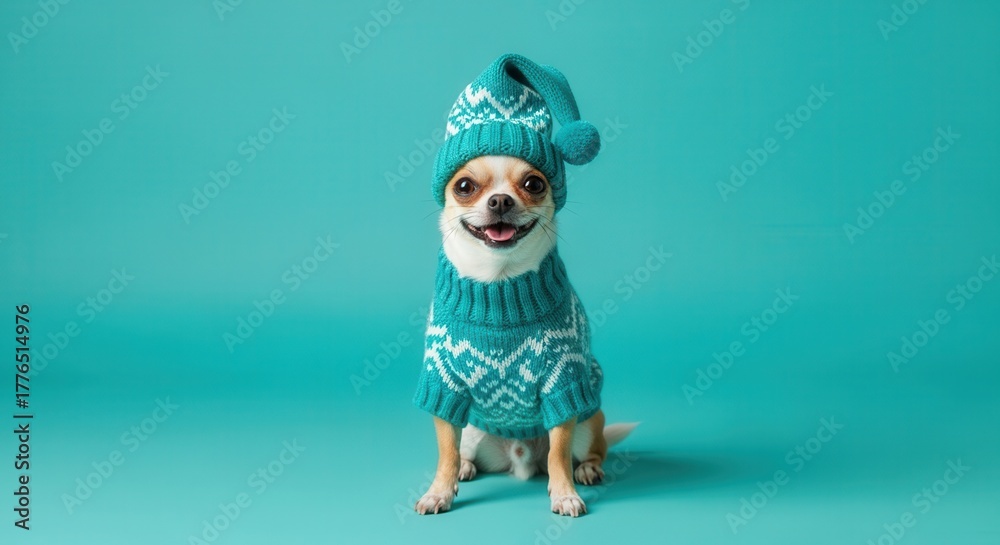 A funny chihuahua dog wearing a turquoise winter sweater and matching hat. Cute pet dressed for the holidays on a solid color background. Christmas jumper day concept with copy space #1776514976