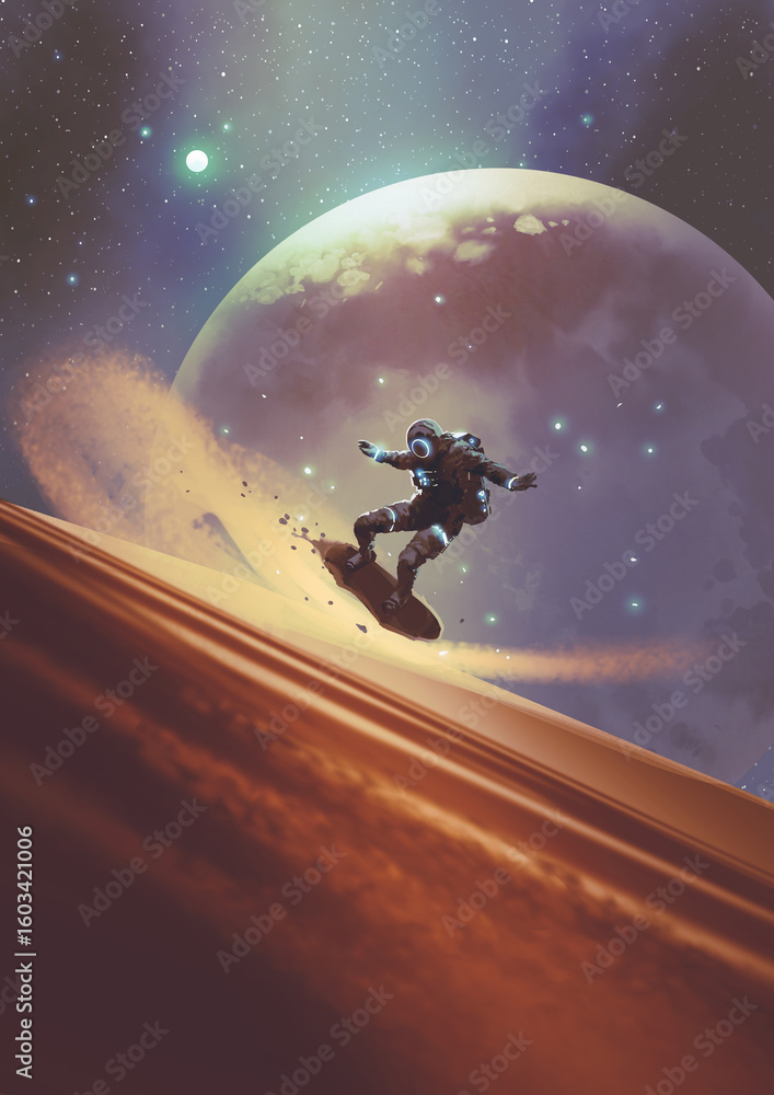 A futuristic astronaut rides a board down a massive sand dune on an alien desert world beneath a glowing ringed planet, digital art style, illustration painting #1603421006
