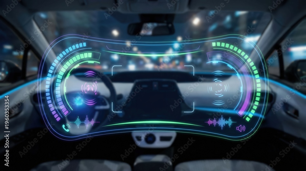 A futuristic car dashboard features a glowing holographic interface with biometric and navigation data. #1960353354