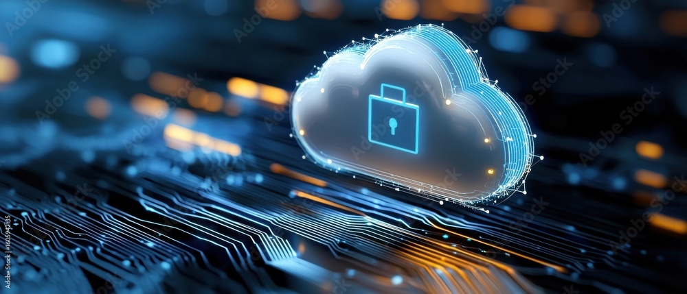 A futuristic digital security system with blue encrypted cloud networks, representing the protection of data and communication in a high-tech, innovative environment. #1605942135