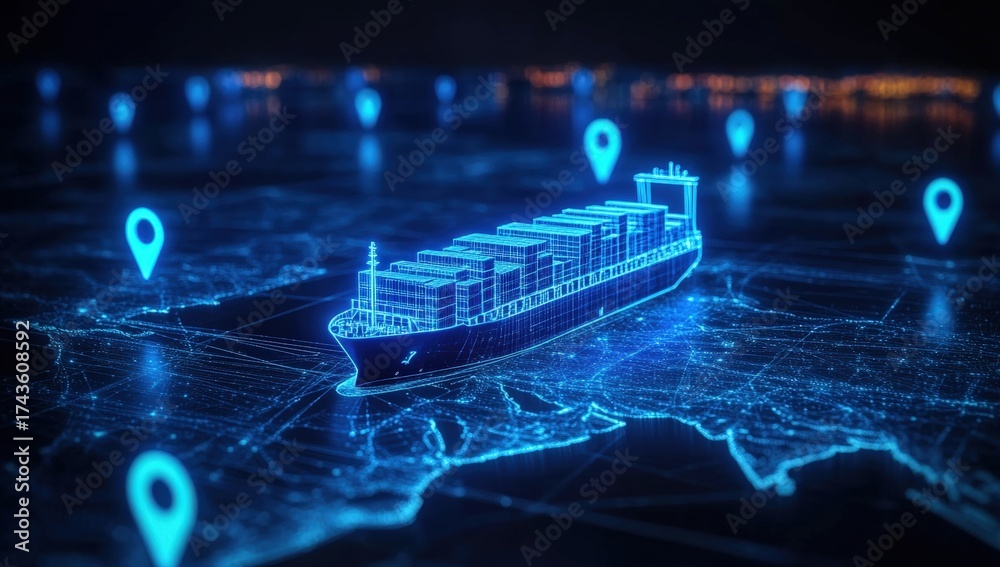 A futuristic holographic representation of a cargo ship navigating a digital map with location markers. #1743608592