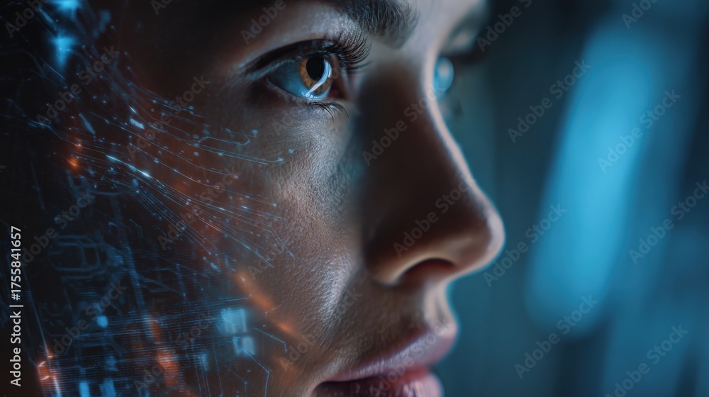 A futuristic office with glowing interfaces, a scene of AI transformation and empathy interface. #1755841657