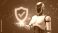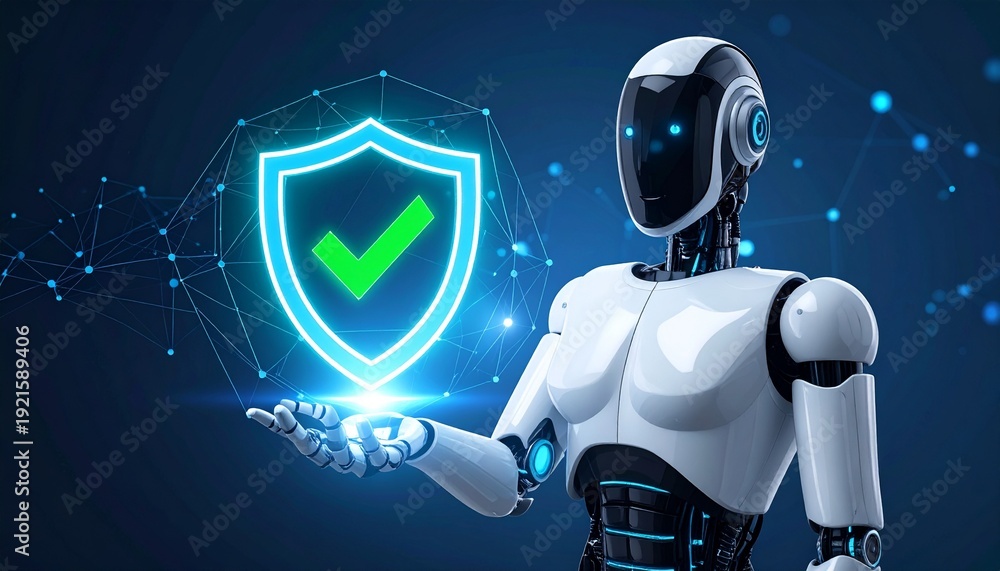 A futuristic robot presenting a security shield, showcasing safety and protection in the digital realm #1921589406