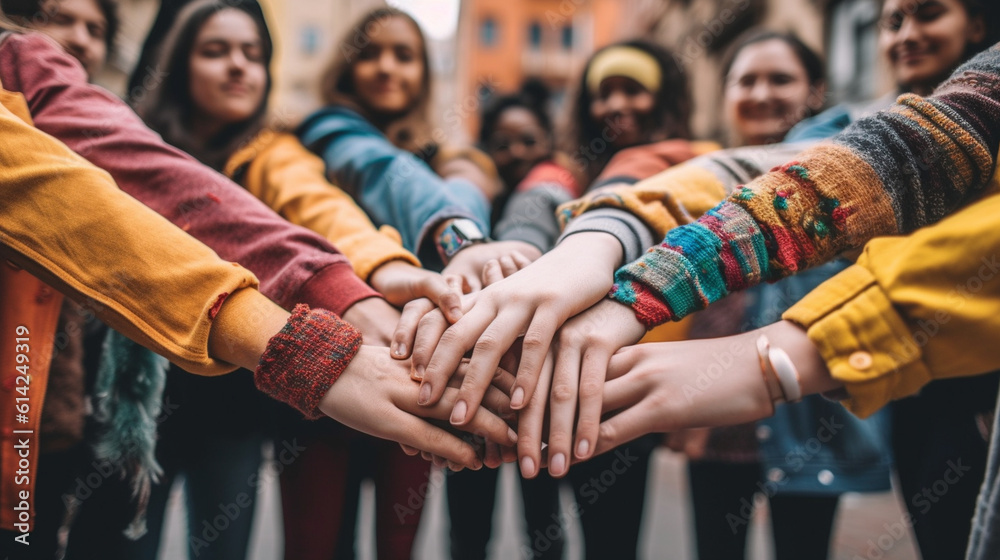 A gathering of individuals from the LGBTQ+ community interlocking their hands in an outdoor setting - A joyous assortment of friends with different backgrounds embracing one anothe Generative AI #614249319