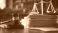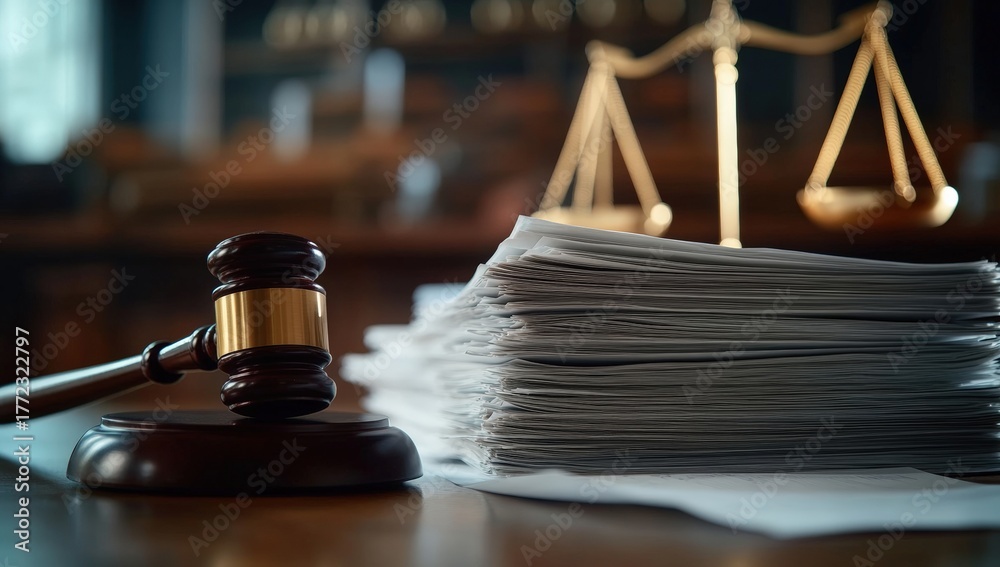 A gavel and scale of justice sit beside a stack of documents, symbolizing law, order, and the judicial system in a courtroom setting. #1772322797