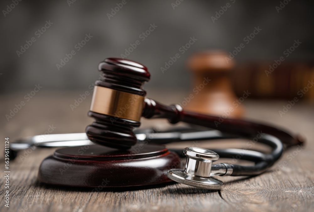 A gavel and stethoscope resting on a , symbolizing legal and medical concepts, healthcare, and justice. #1639611124