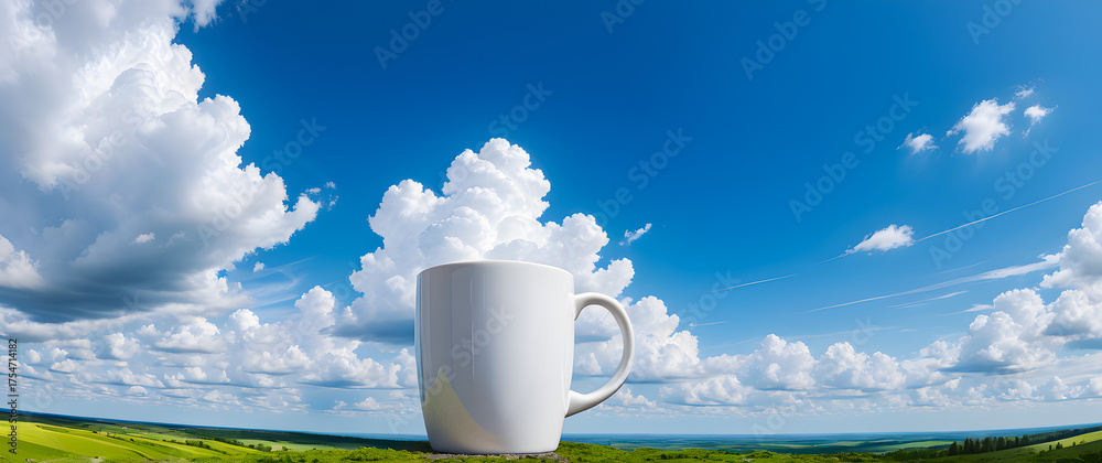 A giant white mug in a peaceful green field. Fantasy landscape with huge mug under blue sky. Surreal scene of a massive cup and fluffy clouds. Dreamy meadow featuring a giant white coffee cup. #1754714182