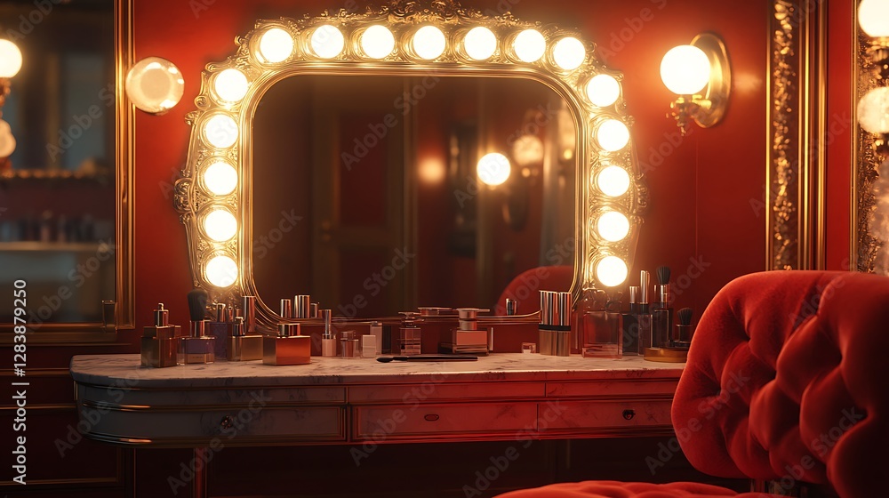 A glamorous 1950s Hollywood dressing room with an ornate vanity mirror framed by warm golden bulbs, vintage makeup essentials scattered on a marble tabletop, and a luxurious red velvet chair. #1283879250