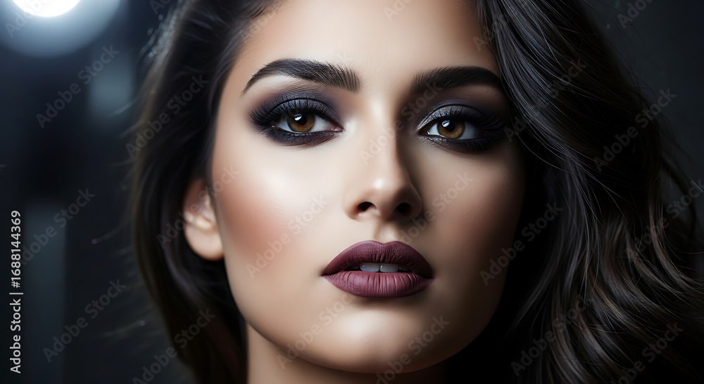 A glamorous woman with dark wavy hair gazes intently, wearing dramatic smoky eye makeup and dark lipstick. #1688144369