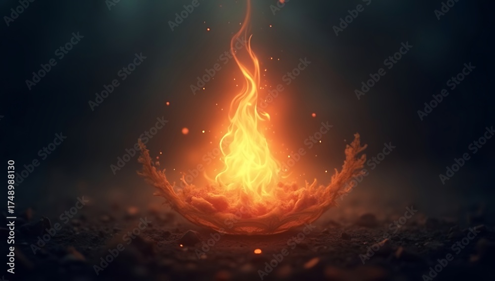 A glowing abstract flame in the center of dark background, symbolizing eternal faith, devotion, and the search for divine truth beyond religions. #1748988130