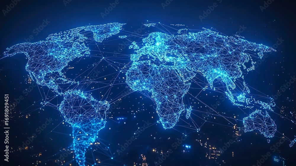 A glowing blue digital map representing the world and its connections #1691809451