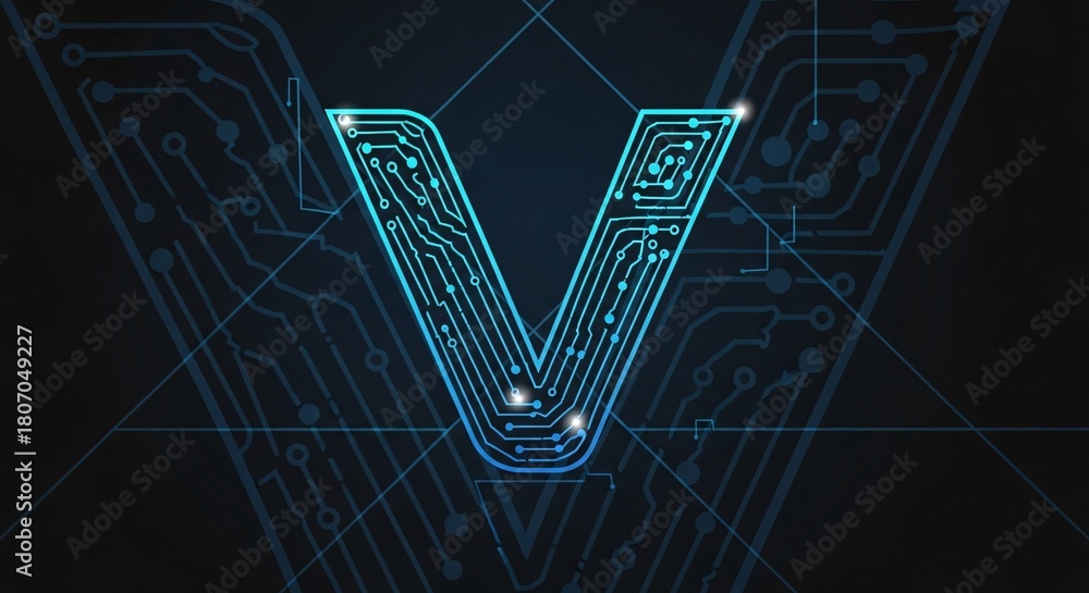 A glowing blue letter v with circuit board design on a dark blue background with circuit patterns #1807049227