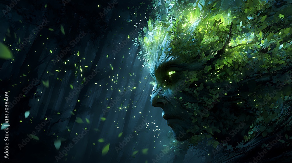 “A glowing forest spirit rising from ancient trees, surrounded by floating leaves and green light particles, ethereal atmosphere, hyper-realistic fantasy art, 32K resolution #1817038409