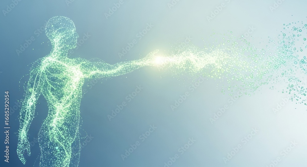 A glowing green outline of a human body emits vibrant energy particles from its outstretched hand, symbolizing digital health, healing energy, biotechnology, human potential, and scientific advancemen #1605292054